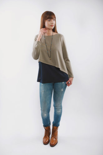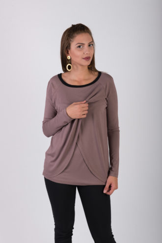 This stylish nursing top, chic crep top will be on the top of your list for this years festive outings. Easily combined with both maternity trousers and skirts this chic top can be worn from pregnancy to breastfeeding and beyond weaning. Our double layer maternity & nursing top is a feminine option, perfect before, during & after pregnancy. Made in the softest jersey with a semi-sheer viscose layer peeking out underneath the hem, this maternity top offers a relaxed, flexible fit, designed to grow with your curves. After baby is born, the top layer lifts up to reveal concealed access for breastfeeding – transforming the style into a fashion-forward nursing top.